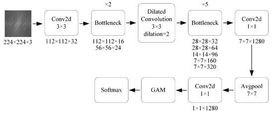 Based on MobileNetV2, the network model was improved for the characteristics of frequency-domain images, and the improved network structure is shown in Figure 4 and named MobileNetV2g. First, a layer of dilated convolution [] was added to the shallow part of the network backbone to increase the perceptual field to expand the feature extraction range. Second, a global attention mechanism (GAM) [] was added behind the final 1 × 1 convolution layer to extract more useful information.