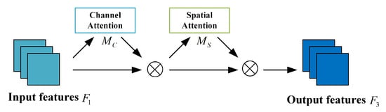 where and are the channel attention map and spatial attention map, respectively, and ⨂ denotes the multiplication operation by element.