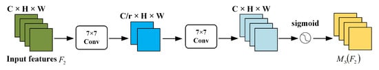 In the spatial attention submodule, two convolutional layers with 7 × 7 convolutional kernels are used for spatial information fusion to focus on spatial information. We set the reduction rate r of the channel attention submodule to 4. Since maximum pooling reduces the use of information, the pooling operation is removed here to further preserve the feature mapping, but this in turn causes the spatial attention module to increase the number of parameters. The spatial attention sub-module is shown in Figure 7.