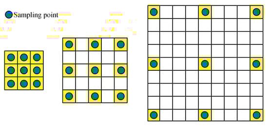 Dilated convolution expands the perceptual field by adding holes to the traditional convolution and expands the convolution kernel without increasing the number of parameters so that the convolution kernel extracts more feature information. Dilated convolution introduces a hyperparameter called dilation rate, which defines the number of intervals between the points of the convolution kernels. As shown in Figure 8, the initial convolution kernel size of all three images is 3 × 3; the dilation rates are 1, 2, and 4 from left to right; and the perceptual fields are 3 × 3, 5 × 5, and 9 × 9, respectively.