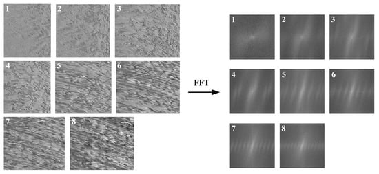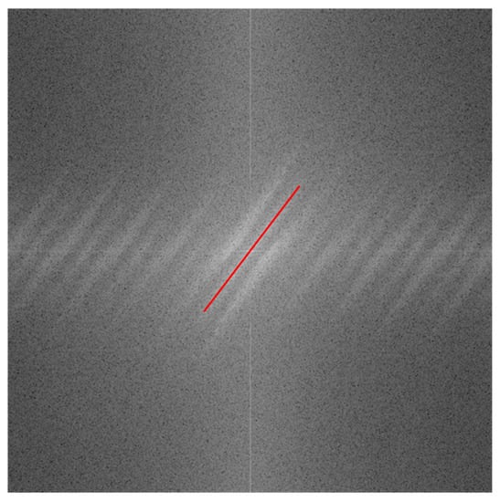 The MOT of the video-generated space-time images is not necessarily an integer angle, so it was approximated as an integer angle according to the principle of rounding, and this error is within the allowable range. From each type of space-time image above, 12 images, 60 in total, were selected to calculate the MOT of each one, which was calculated as follows: firstly, the space-time images were converted to the frequency domain; then, the main direction of the spectrum of the frequency-domain images was marked manually, as shown in Figure 14; and the slope was calculated according to the pixel coordinates and of the two endpoints of the line segment. Since the main directions of the spectrum and the MOT are mutually perpendicular to each other, the MOT was finally calculated.