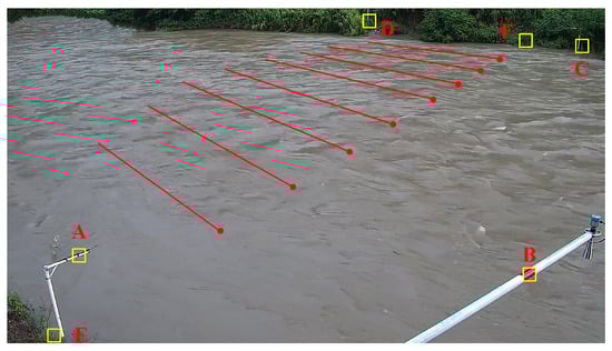 Our model is trained on mixed datasets, and the river measured at the Baoji station is natural. To verify the measurement effect of the model on the artificial river, the generalization performance verification experiment of the model is reported in this section. The experimental site was the Dali hydrological station, and the camera view and ground calibration points are laid out in Figure 18. During the test period, the weather was clear, and the river banks in the flow measurement area were very regular; a thin line spanning diagonally from the top left to the bottom right of the viewpoint into the river channel masked the measurement. With DA as the section line, D as the starting point, and A as the ending point, the section data are shown in Table 10. The bank coefficient of this hydrographic station is 0.80, and the water’s surface-flow coefficient is 0.82.