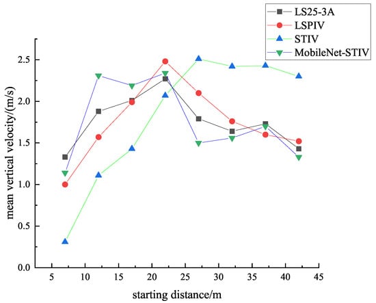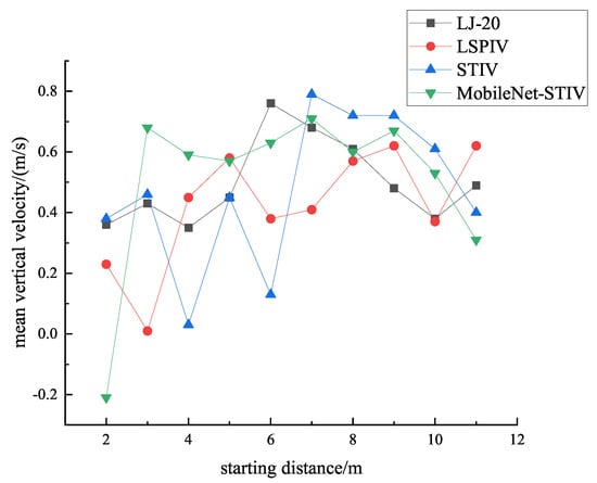 The present method is compared with the current meter method, LSPIV, and STIV for the experiments; and the mean vertical flow velocity, mean flow velocity, and discharge measured by each method are shown in Table 7. A comparison of the mean vertical velocity is shown in Figure 17. In the hydrographic measurements, the results obtained by the current meter are taken as the true values. After calculation, the absolute and relative errors of the three methods are shown in Table 8 and Table 9, respectively. When analyzing the data in the tables, it can be seen that the mean vertical velocity measured by the present method at each starting distance is closer to the true value than the results measured by STIV. Compared with LSPIV, only at the starting distances of 12, 17, and 42 m is the error of the mean vertical velocity measured by our method greater. Regarding the relative error of the mean flow velocity, the method improved by 5.74% compared with LSPIV and 7.65% compared with STIV. Compared with the relative error of discharge, the present method improved by 5.83% than LSPIV and 7.64% to STIV. Taken together, the present method achieves values very close to the true values measured by current meter method.