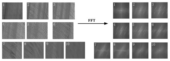 The dataset plays a key role in the training of the model, and since there is a lack of space-time images with high-accuracy MOT, we synthesized space-time images using Perlin noise [] with strong MOT consistency and a smooth texture, as shown in Figure 10a. The orientation is set by humans, so the angle is accurate and known. The space-time images were converted to the frequency domain by FFT, as shown in Figure 10b, and the synthetic dataset was constructed with frequency-domain images from to in steps, divided into 180 classes: there are 100 images in each class in the training set, for a total of 18,000 images, and 20 images in each class in the test set, for a total of 3600 images.