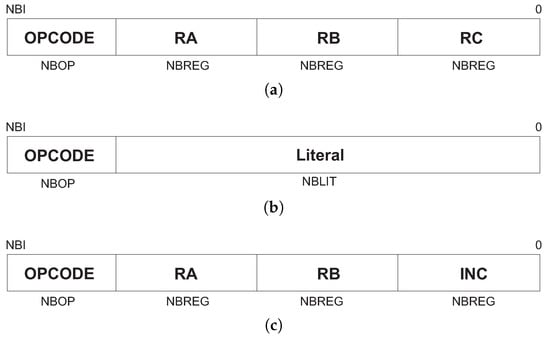 The instructions are represented in three different formats: R, L, and M. The instruction word is divided into two to four fields, according to the format, as can be seen in Figure 2. The OPCODE field is common to all formats and it stores a unique identification for the instruction. RA, RB, and RC indicate register addresses in the register bank. Fields Literal and INC store constants. The sizes of all fields are configurable, according to the number of implemented instructions and registers.