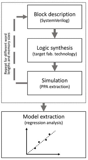 A model extracted from synthesis results for each building block is used for statistical simulation in which it is possible to determine the more appropriate configuration to be used in the customized microprocessor. These models are based on the simulated results for area, power consumption, delay time, and energy per operation at gate level. Each characteristic is modeled in relation to the size of the block (in the case of memory and register bank) and with respect to instruction or data word size. Figure 3 depicts the model extraction procedure. The block model can be easily extracted from the results obtained by the logic synthesis for different configurations. For example, the area occupied by the program memory is estimated based on the number of instructions it contains and on the instruction word length. A set of synthesis points is generated for a given range in order to evaluate the behavior of this characteristic. So, regression analysis is used to fit a predictive model from the observed points, which provides a generic function of the memory silicon area in relation to the instruction length and to the program size. This model is dependent on the target fabrication process, since the logic synthesis requires information about the fabrication technology. The linear model is used when the modeled characteristic approximates the linear behavior, which happens in most of the situations. Otherwise, other types of approximations can be used that best fit, such as logarithm or exponential functions.