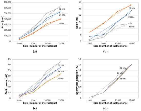 Program memory characterization in terms of memory size for different instruction lengths (16, 24, and 32 bits). Trend lines (dotted) indicate the linear regression used for modeling the behavior of the characteristics. (a) Area. (b) Delay. (c) Static power. (d) Energy per operation.