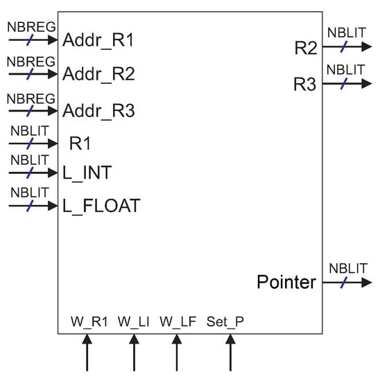 The control signal Set_P and the output signal Pointer are implemented if data memory read and write instructions are implemented in the instruction set. Control signals W_LI and W_LF are implemented only if there are instructions for writing integer and floating point literals on registers. In this case, these literals appear at inputs L_INT and L_FLOAT, respectively.