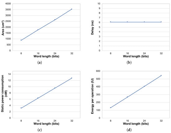 Register bank characterization in terms of data word length. (a) Area. (b) Delay. (c) Static power. (d) Energy per operation.