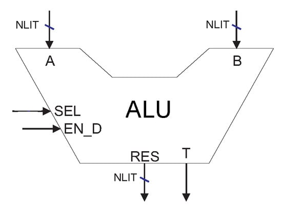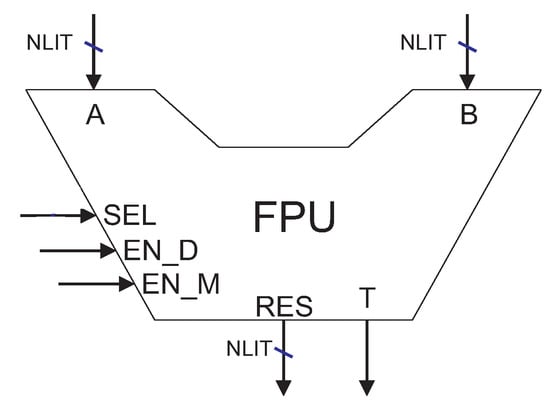 The implementation of the floating point unit (FPU) depends on the number of bits for representing the mantissa and the exponent of the floating point number. The overall block size is related to the number of implemented floating point arithmetic operations, which, in turn, are determined by the existence of the respective operation in the instruction set of the customized microprocessor. Figure 8 presents the logic block of the FPU, in which A and B are the input operands, RES is the output result and SEL is a control signal indicating the operation to be performed (sum, subtraction, multiplication or division).