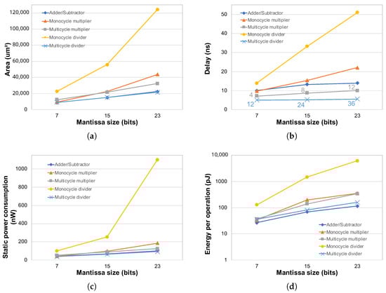 Floating point unit characterization in terms of mantissa size. (a) Area. (b) Delay. (c) Static power. (d) Energy per operation.