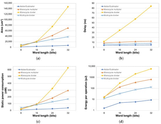 Integer arithmetic unit characterization in terms of data word length. (a) Area. (b) Delay. (c) Static power. (d) Energy per operation.