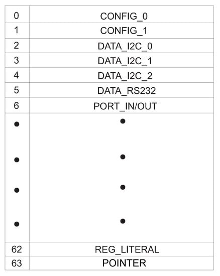 Registers CONFIG_0 and CONFIG_1 are reserved for the implementation of configuration signals and interruption control. Registers DATA_I2C_0, DATA_I2C_1, DATA_I2C_2 and DATA_RS232 are reserved for the data exchange between the processor and the communication modules. Register PORT_IN/OUT is used for the configuration of directions and values of the input and output pins. Registers REG_LITERAL and POINTER have the function to store the input literal and the data memory pointer, respectively.