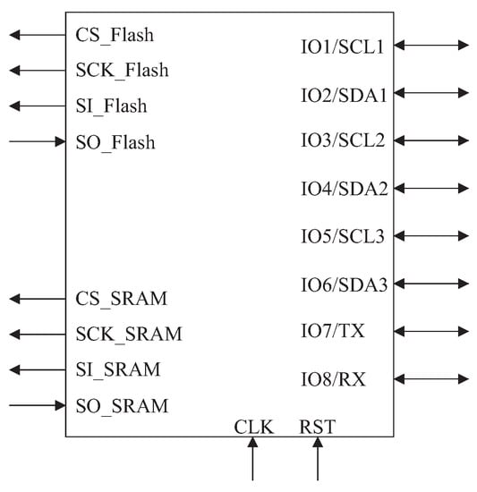 The implementation of the data and program cache memories, with the remaining memory in the external part of the chip communicating by means of SPI protocol, allows the use of only eight input/output pins for data transfer between memory and CPU. With the remaining pins of “clk”, “rst”, “vdd” and “gnd”, and the four communication modules, the overall circuit needs a total of 20 input/output pins. Figure 22 presents the final pin scheme of the customized processor.