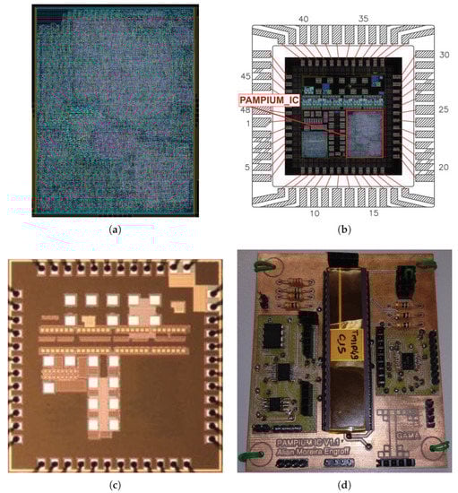 PAMPIUM IC layout and chip implementation. (a) Layout of the PAMPIUM IC. (b) Complete layout of the multi-user chip. (c) Photography of the prototyped chip. (d) Test setup PCB.