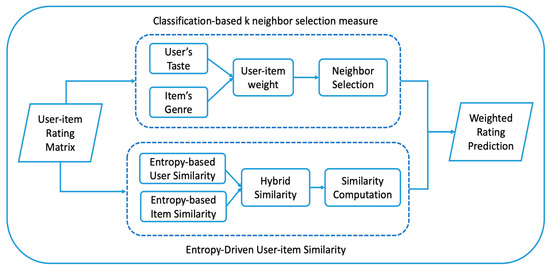 In this paper, we focused on memory-based collaborative filtering [22]. The main challenge was to determine which group of users had a similar preference to the target users [16,23] (i.e., to find an appropriate measure of user similarity). Researchers have used different side-information [24,25,26,27] to obtain a more effective similarity to improve the prediction accuracy of recommendations [28,29]. It is natural to think that we are likely to accept suggestions from similar partners [30,31]. For this reason, many aspects of both users and items are often used as auxiliary information to find similar preferences among users in CF [17,18,19,20,21]. However, due to various reasons, it is difficult to obtain a direct similarity relationship. In contrast, implicit similarity relationships are inferred from user preferences. If a user is more knowledgeable about a given subject, we assume that they are more reliable. Information entropy is the indicator that we can use to measure the amount of information [32,33]. This is a popular indicator to measure the amount of useful information and is often used by researchers to improve accuracy [21,34,35]. By using information entropy of the ratings on items and users, our proposed method considers the rating behavior of users on each common item as well as the history of ratings made by each user. We then used the entropy to make a rating prediction. Inspired by the traditional kNN method [36,37], we proposed a novel method of choosing neighbors. We then merged the entropy with classification information. We used classification information to find a more suitable similar user in the global view.
