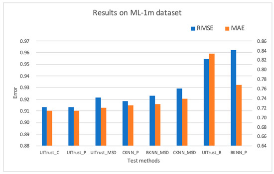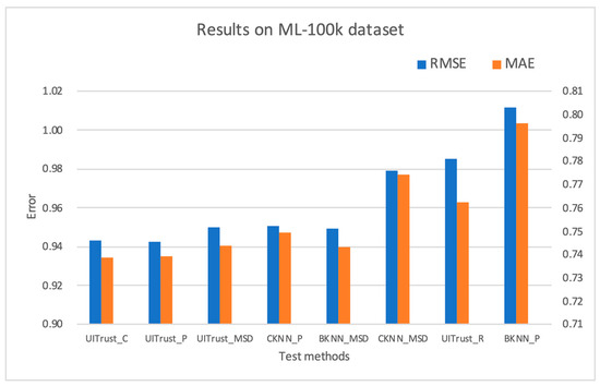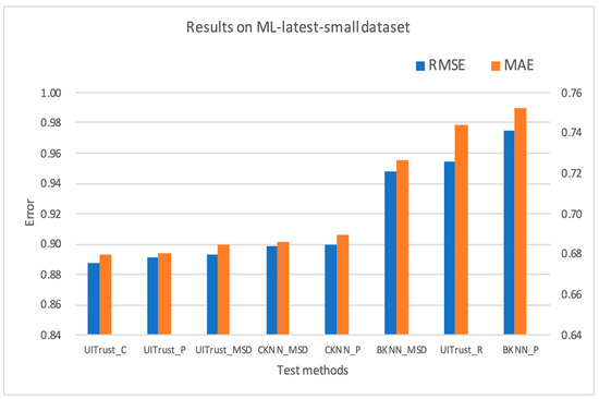 The results for the ML-latest-small dataset showed a similar pattern to those obtained on the ML-100k dataset as shown in Figure 3. In particular, UITrust_C ranked first, with a slight increase of 0.55% in the root mean squared error (RMSE) and 0.12% in the mean absolute error (MAE) compared to UITrust_MSD. There was also an increase of 1.16% in RMSE and 0.92% in MAE compared to the official baseline method CKNN_MSD. In addition, we found that UITrust with the mean squared difference (MSD) similarity exhibited a significant improvement against BKNN_MSD, with an increase of 5.81% in RMSE and 6.30% in MAE. Similarly, UITrust_P with the Pearson similarity showed a significant improvement against BKNN_P, with an increase of 8.62% in RMSE and 8.41% in MAE. Both UITrust_P and UITrust_MSD performed roughly as well as the method using entropy-based similarity. However, UITrust_P did not outperform the CKNN methods in terms of MAE. As for UITrust_R, this method did not perform better than CKNN_P, CKNN_MSD, and BKNN_MSD, but still exhibited an increase of 2.13% in RMSE and 1.18% in MAE compared to BKNN_P.