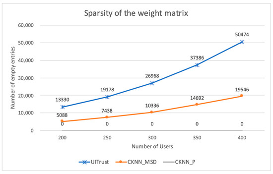 In order to compare the sparsity of the weight matrices among different methods, in Figure 5, we present a plot showing the number of empty entries in the weight matrix. The dataset that we used here was ML-100k. For the kNN-based methods, the weight matrix was the similarity matrix. We chose two different types of similarities, MSD and Pearson, for the result comparison. For our method, we used the classification-based k-neighbor selection measure and entropy-driven user–item similarity for plotting.