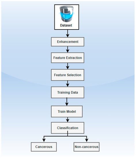 The foregoing issues can be addressed by applying computer-aided diagnosis (CAD) tools for cancer pathology []. Innovative diagnostic methods can assist in improving accuracy rates, minimizing mistake rates in cancer classification and assessment, and reducing physicians’ efforts []. Designing appropriate approaches to histologic capturing, pre-processing, and the smart extraction of features for the computer-assisted screening of disease is a difficult challenge []. Various techniques used for predicting survival in big and diverse cancer databases have been established and multi-class segmentation models also diagnose chest diseases by segmenting the organs accurately [,].