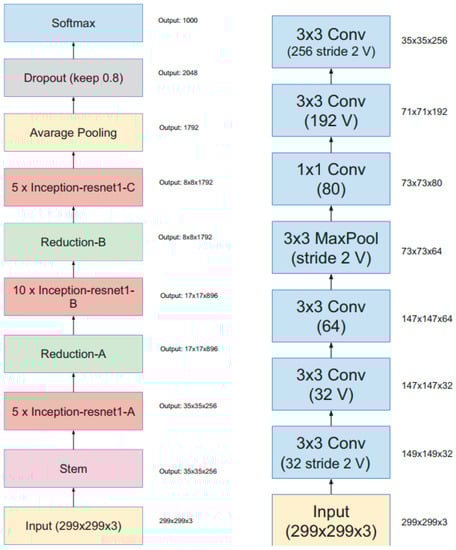 The DL model InceptionResNetV2 is used as a backbone model [] and images are resized to 299 × 299 × 3 as per the model requirement. The InceptionResNetV2 architecture is shown in Figure 3. The proposed methodology is based on transfer learning using InceptionResNetV2, which is pre-trained on the ImageNet dataset, with the last layers fine-tuned on the breast cancer dataset to achieve a better score.