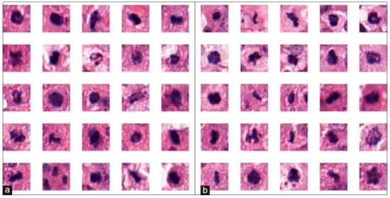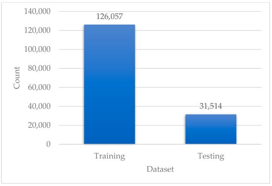The dataset was collected from an open source library of breast histopathology images []. The dataset contained the data of cancer-affected patients, and healthy patients, as shown in Figure 4. Cancerous patches appear more violet and packed than normal patches. All patches with a size of 50 × 50 were extracted from the specimens. The dataset is publicly available in the open source library of breast histopathology images. The dataset extracted from invasive ductal carcinoma contained 78,786 IDC-positive and 198,738 IDC-negative patients. The dataset labeled by human specialists by specifying the ground truths made a significant proportion of patch-level annotations. From the original dataset, we considered the number of labeled patches in the dataset to be 157,572, and the division ratio of the dataset was 80% for training and 20% for testing, as shown in Figure 5.