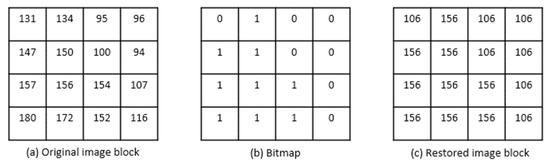 An example demonstrating AMBTC compression is shown in Figure 1. Figure 1a shows an original image with a block sized 4 × 4 pixels, and its corresponding bitmap can be derived based on Equation (2) when the average value of the original image block is computed. According to the bitmap shown in Figure 1b, two quantization levels for the two groups are calculated by Equations (3) and (4). Finally, the restored image block can be constructed based on two quantization levels and a bitmap.