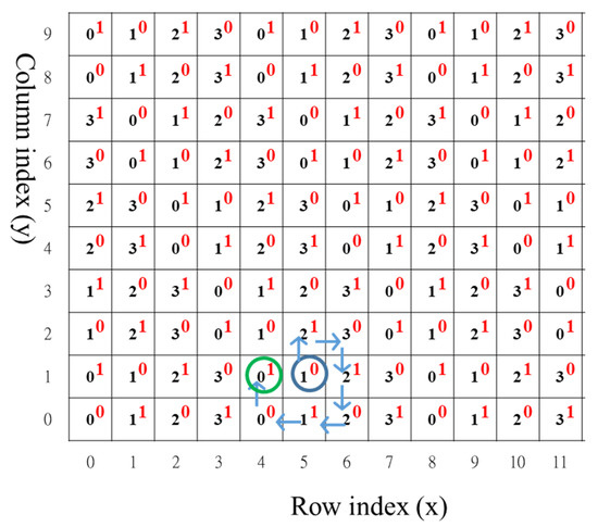 Although the mapping operations are complex, its idea is quite straightforward. Our objective is that pixels in a block only require slight modifications so that the modified pixel pair’s coordinate can map to its corresponding AC and RI via matrices BD and WT. In other words, to carry the 24-bit hidden watermark, we divided it into eight segments, and each segment contained only a 3-bit watermark called msgi, where for an embedding block sized 4 × 4. Two pixels in an embedding block form a pixel pair, and two transformations are defined in Equations (8) and (9). With these two transformation functions, the corresponding 3-bit watermark can generate two different values when mapped to matrices BD and WT, respectively, as shown in Figure 5 and Figure 6, respectively.