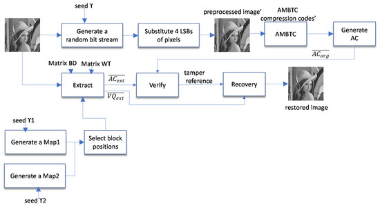 The process of the watermark generation and embedding is illustrated in Figure 3. We assume that the original image is an 8-bit grayscale digital image of n pixels, where all possible pixel values are integers in the range [0, 255]. The original image is divided into non-overlapping blocks of 4 × 4 pixels. For each block, we generated an 8-bit authentication code derived from its corresponding AMBTC compression code that would be used to detect any modification made to the image. To generate the AMBTC compression codes for a given image, we first used a random seed γ to generate a random bit stream of length 4n bits and then used the bit stream to substitute 4 LSBs of the original image to obtain the preprocessed image. For each block of 4 × 4 pixels in the preprocessed image, we computed the triple (, , BM) by AMBTC and generated the 8-bit authentication code AC as: