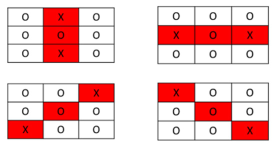 The random seeds γ1 and γ2 are used to generate two non-repeating sequences: Map1 and Map2, respectively. For each block, we compare with of its mapping block selected from Map1; if they are not equal, we mark it as invalid. To refine the tamper detection result, we took into account the block’s surroundings. After the first round of tamper detection, we further marked the central block as invalid in these cases, as shown in Figure 9.