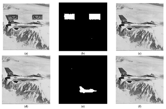 The visual performance for Airplane: (a) Copy-paste attack 1, (b) Detection of (a), (c) Recovery of (a), (d) Copy-paste attack 2, (e) Detection of (d), and (f) Recovery of (d).