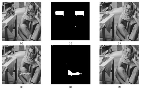 The visual performance for Barbara: (a) Cutting attack 1, (b) Detection of (a), (c) Recovery of (a), (d) Cutting attack 2, (e) Detection of (d), and (f) Recovery of (d).