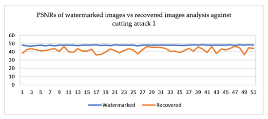 PSNRs of watermarked images vs. recovered image analysis against cutting attack 1.