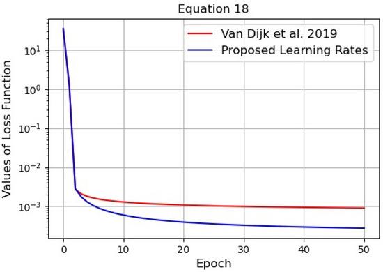 Figure 4 displays the experimental results using our theoretical framework on the function given in Equation (18). The empirical results show that the proposed learning-rate scheduler achieves remarkable success in obtaining a faster convergence rate for optimizing the SGD method. In addition, the idea of adapting network parameters to various levels of learning enhances the effectiveness of the neural network for analyzing convex optimization problems. CDC-based updates on learning rates proved to perform better than a single rate-based method to adjust the network parameters. The main problem of adjusting network parameters based on a single adaptive rate comes from the fact that the objective function for the multilayer network is not an explicit function of the weights and biases in the hidden layers. The effectiveness of our framework is characterized by allowing the parameters of the objective function to be tuned with respect to the architecture and performance of the deep neural network.