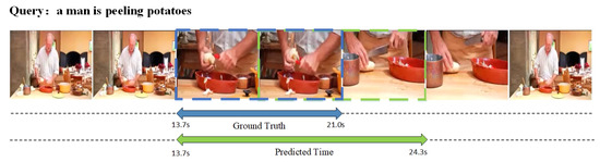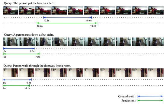 Figure 6 shows three visual predictions on the Charades-STA dataset. The area represented by the blue line is the ground truth; the green line is the predicted segment. We expect to estimate the start and end timestamps closer to the ground truth. The three examples in Figure 6 show that the prediction result has a high IoU on the Charades-STA dataset. However, in the first example, the start and end timestamps of the prediction have errors compared to the ground truth. Therefore, the first example results are unsatisfactory and may lead to considerable errors in the prediction results on long videos.