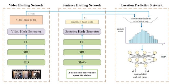 This section will first provide a description of the moment location task and then describe the proposed VMLH model and its training and reasoning process. Figure 2 shows the framework of the VMLH, which includes three components: a video-hashing network, a sentence-hashing network, and a location-prediction network. Each part will be detailed in the next section. The main framework of the model is to extract video features through the I3D network and extract text features through GloVe; then, it uses GRU to extract the advanced features of these two modes and map them to a hash matrix; next, the similarity between the two hash matrices is calculated and fed into the MLP to locate the final timestamp. The idea of the VMLH is to train a model so that it can generate a set of hash codes for video v ( is the hash code of video clip , and T is the total number of video clips) and generate hash code for a query sentence s. Generally, the task of hashing is to convert the original video, image, or text into binary codes. The values −1 and 1 are obtained with the proposed method, and we also can convert them into 0 and 1 for XOR operations. Then, using the location prediction network, the start and end timestamps are predicted by calculating the similarity among the hash codes.