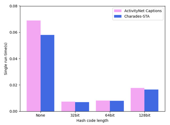 Except as specifically mentioned, the hyperparameter settings were identical for both datasets. All the experiments of the model efficiency were run in an Nvidia TITAN Xp GPU on Ubuntu 16.04 with 256 GB memory. The video and sentence hash codes were both 64-bit. The 500-dimensional C3D [24] features and 1024-dimensional I3D [25] features were used in the datasets ActivityNet and Charades-STA, respectively. The output dimension of the sentence encoder GloVe was 300. The hidden layer sizes of the LSTMs and FCs were 256 and 128, respectively, regardless of whether they were in a video or a sentence hash network. In addition, and were set to 0.01 and 1/6, respectively. Moreover, we sampled the videos on the Charades-STA and ActivityNet evenly to 64 clips and 128 clips, respectively. All experiments were conducted using the Adam optimizer with a learning rate of 0.001 and a batch size of 64 for 50 epochs in PyTorch. In building the project code, we used the framework of Pytorch and Torch Lightning, and we used Wisdom to visualize the training process.