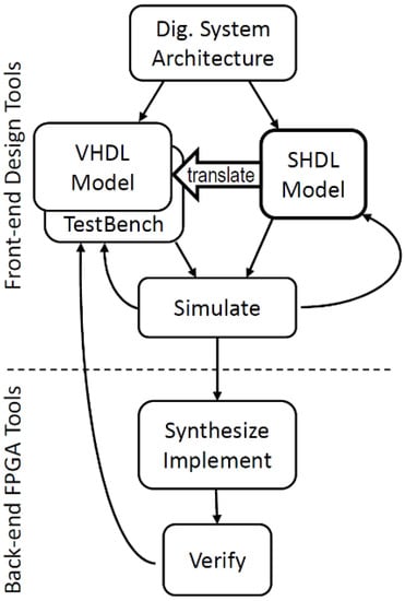 To facilitate learning HDL, we developed a language with a small set of syntax rules, called SHDL, and a tool that provides an intuitive simulation setup []. SHDL is seamlessly embedded into the existing digital systems design flow as a front-end modeling tool that produces standard HDL output (Figure 2). The components of the digital system architecture are designed and simulated as VHDL or SHDL models. The translated VHDL is used for synthesis, implementation and verification with back-end Field-Programmable Gate Array (FPGA) tools. SHDL can be introduced into the digital systems design course with only minor additions to the course material, and students can choose their preferred design language.