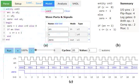 The tool’s web page consists of three sections: design input with setup, simulation and output data. Setup sets the parameters for the code parser and generator, as well as the report and simulation settings. The code generator settings define the syntax of VHDL 2008 or VHDL’93, with additional experimental Verilog support. The code editor is based on CodeMirror, which provides coloring of VHDL syntax. Figure 3 shows the user interface of the SHDL tool, with an example of a 3-bit counter. A circuit description begins by specifying the circuit name, and defining signals in the signal table (Figure 3a): this step is optional, and is used to automatically prepare the initial SHDL code with entity statements and signal declarations. After the SHDL model description and parsing (Parse button), the signal table is used to define the signals displayed in the simulation waveform.