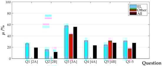 (I) The prior-knowledge test was administered online, and was not mandatory. The questions were asked sequentially in random order, and the possible answers were randomly shuffled. The students had 15 min to answer the questions. The results are shown for 26 students, 19 of whom were from the EL study track, and 7 of whom were from other tracks (Figure 7). Questions Q1, Q2 and Q4 were scored 0% if incorrect and 20% if correct. Question Q3 had two correct answers, with the better one scored at 20% and the other at 10%. Question Q5 had five sub-questions, each contributing 4% to the total score of 100%.