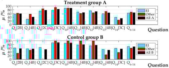 (II) There were 34 students enrolled in the DESD course during the 2020/2021 academic year. The final test was mandatory for all students. There were 18 students in the treatment group (A), and 16 in the control group (B). Group A comprised 61% students from the EL study track, and 39% from the other tracks. Group B was the control group, comprising 87.5% electronics students and 12.5% from the other tracks. The results for the final test are presented in Figure 8, and are tagged according to the revised Bloom taxonomy (the process dimension is tagged 1–6, and the knowledge dimension, A–D).