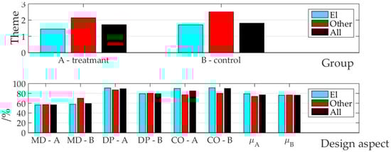 (IV) Final project results. Figure 10 shows the results of the final project report assessment. The students in both groups—the treatment group A (1.72) and the control group B (1.81)—selected, on average, moderately graded subjects that used the CPU for simple animations on the output display. While the difference in average-scored topics was only 2.5%, it should be noted that in groups A and B, students from the Other study tracks chose higher-scored topics on average than did the EL study track students. The topics included several peripheral units from the exercise examples and innovative design components. This finding is significant, because the students from the Other study tracks were the ones with the least prior knowledge. Both groups, the treatment and the control groups, scored almost the same on average (77%) in the total sum of MD, DP and CO. In both groups, the students scored highest on DP and CO (about 80% to 90%) while they scored a much lower average on MD, of about 60%. Four students designed innovatively: they represented 22%/25% of all students in the A/B group, while students from both groups chose mostly online design solutions, on average. Group A was 10% better on average DP (more parallelism), while group B was 2.7% better on average MD (better modularity), and 5% better on average CO (better rationale). In the group A EL study track, the average score CO was almost 13% better than from the Other study tracks (in group B, there were only two students from the Other study tracks). Group A’s EL study track scored about 10% better than the EL study track from group B.