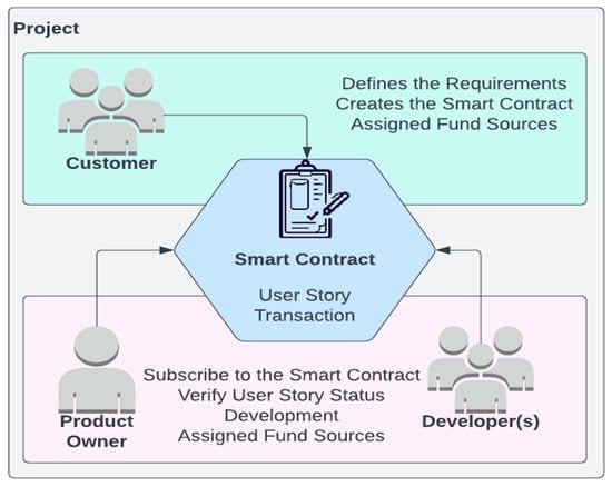 Within the relationship between the smart contract and the Scrum process, we can clearly define three main stakeholders, which are: the client, the product owner and the developer(s). Additionally, we can define a fourth stakeholder as well, which would be the organization the product owner and developer(s) belong to. The fourth stakeholder is unique, because if the client works directly with the product owner and the developer(s), the company can easily be dismissed. Hence, our model aims to support both variations, and as such, we will reference just the three major stakeholders and include the fourth one only where needed. These key stakeholders have the objective of initiating a smart contract via the creation of a user story. They also need to make sure that the user stories are built according to the laid-down criteria. The stakeholders are further divided into two categories: the givers and the receivers. The givers are responsible for laying down the foundations for the user stories and ensuring that the necessary funds are assigned to the smart contract. The receivers are responsible for ensuring that the user stories are executed and match the requirements of the giver. In addition, they are also the ones who will receive the funds once the smart contract’s elements are properly executed.