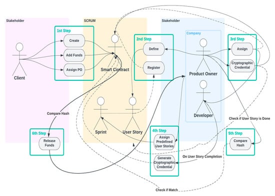 When each sprint starts, the product owner along with the developer(s) will assign the predefined user stories to the sprint and will set the payment due date within the smart contract for each completed user story. Each time a story is completed by the developer, they will need to generate the cryptographic credentials for the acceptance criteria. They need to include these as part of the user story. Developers will add proof of code existence to the cryptographic credential in addition to passing test cases added by the software testers, which should contain the predefined business requirements within the smart contract.
