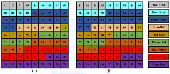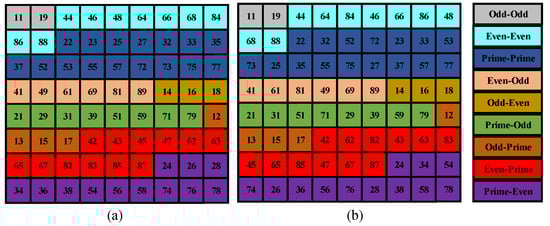 Modules are arranged in the following sequence: odd-numbered rows and columns, even-numbered rows and columns, prime-numbered rows and columns, even–odd, odd–even, prime–odd, odd–prime, even–prime, and prime–even. In this arrangement, the modules in odd-numbered rows and columns are placed first (e.g., , …), followed by those in even-numbered rows and columns (e.g., ), and so on.