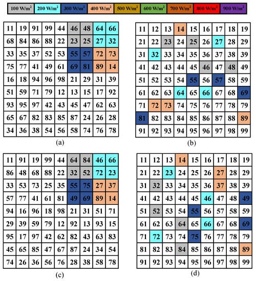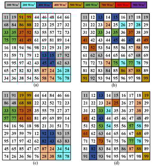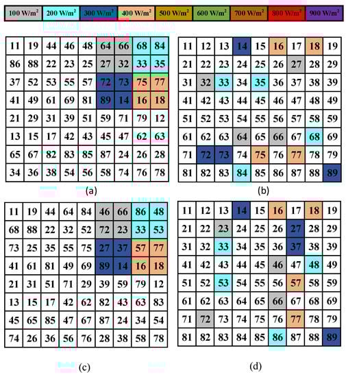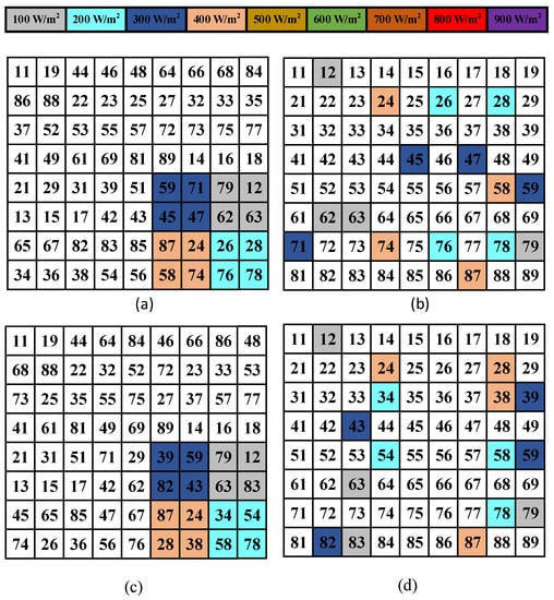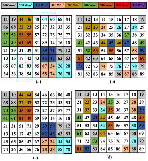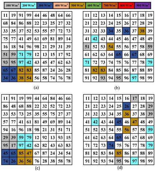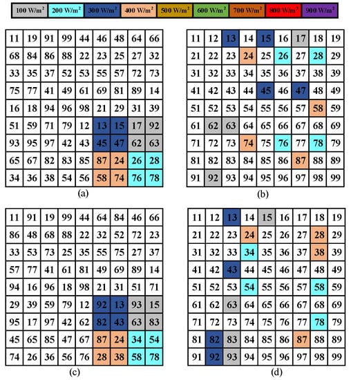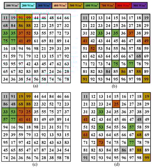 Figure 1 illustrates the OEP and IOEP arrangements for a 9 × 9 TCT-configured PV array. In the 9 × 9 OEP arrangement, a maximum of four PV modules belonging to the same row are displayed in each row, as shown in Figure 1a. In the 9 × 9 IOEP arrangement, a maximum of three PV modules belonging to the same row are displayed in each row, as shown in Figure 1b. Therefore, the IOEP reconfiguration allows for more effective shade dispersion across all rows compared to the OEP reconfiguration.