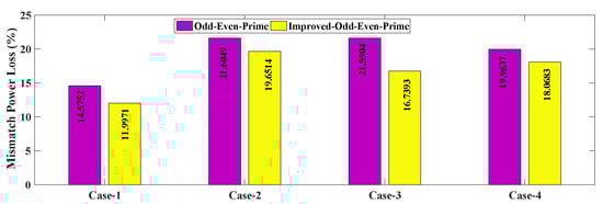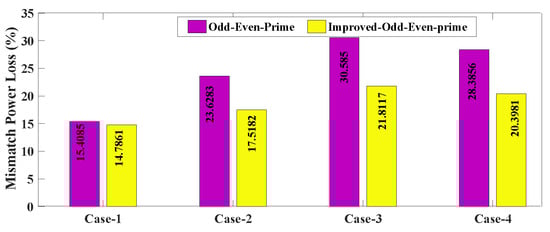 The performance of OEP and IOEP PV reconfiguration techniques has been evaluated using indices, such as mismatch power loss, fill-factor, and efficiency. A bar graph of mismatch power loss (MPL) is shown in Figure 26, with the maximum values for OEP and IOEP being 30.585% and 21.81%, respectively. This indicates that IOEP has a lower value of % MPL and more effectively distributes shade compared to the OEP configuration.