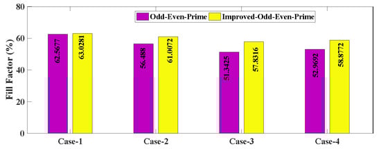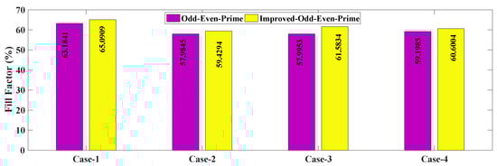 Figure 27 illustrates the variation of fill-factor (%) for OEP and IOEP under different partial shading conditions. The average values of fill-factor (%) for OEP and IOEP are 56% and 60.82%, respectively. The IOEP configuration has a higher average value of FF compared to the OEP configuration, indicating that it has superior performance.