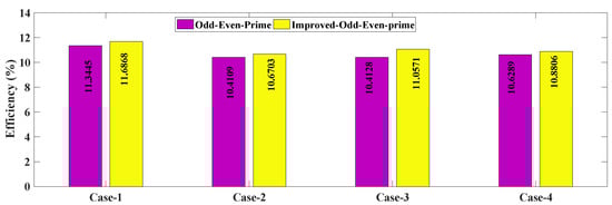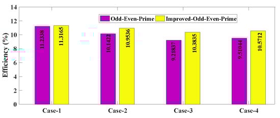 A bar graph of efficiency is shown in Figure 28. From the graph, it can be seen that the range of efficiency (%) for OEP and IOEP is 10.14–11.23% and 10.38–11.41%, respectively. IOEP has the highest range of efficiency, indicating that it performs better than the OEP configuration.