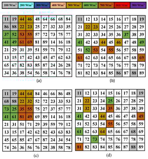 In the 9 × 9 OEP arrangement, in any row maximum of Four PV modules which belongs to the same row are presented, as shown in Figure 1a, whereas in a 9 × 9 IOEP arrangement, in any row maximum of three PV modules which belongs to the same row are presented as shown in Figure 1b. In contrast to OEP reconfiguration, IOEP reconfiguration effectively enables shade dispersion to all feasible rows.