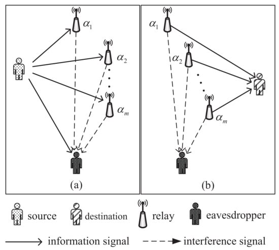 - When , the relay needs to send a certain interference signal to ensure the safety of communication, and the interference power is equal to Equation (12).